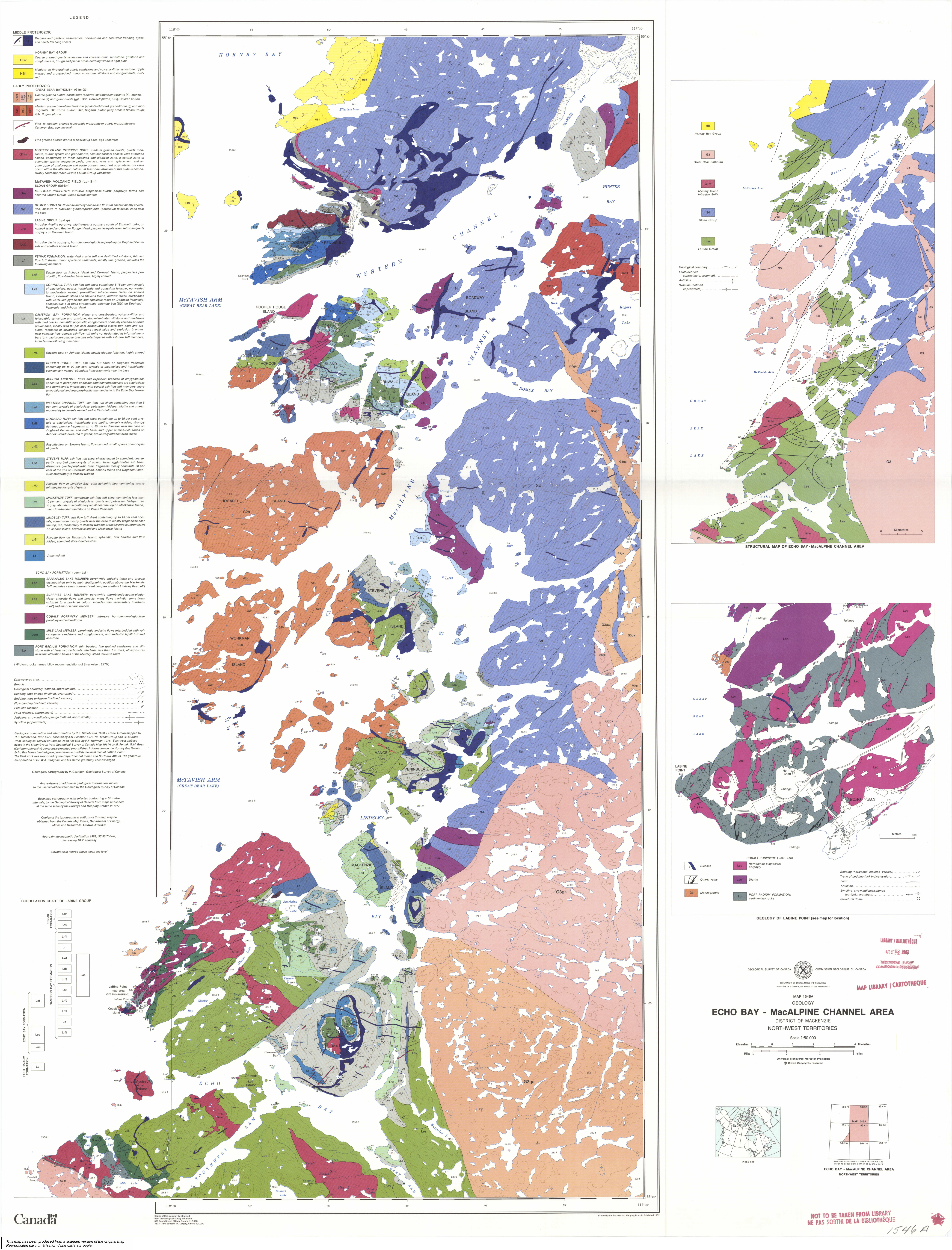 Hildebrand, R.S., 1983, Geology of the Echo Bay-MacAlpine Channel area, District of Mackenzie; Geological Survey of Canada, Map 1546A, scale 1:50,000.